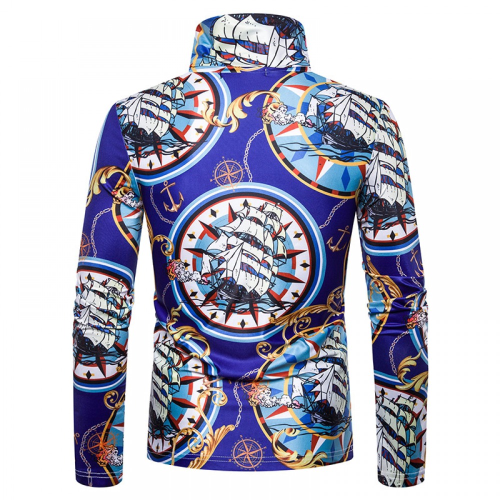 New Men's Large Size 3D Retro Pattern Printing High Neck Long Sleeve T-Shirt Bottoming Shirt